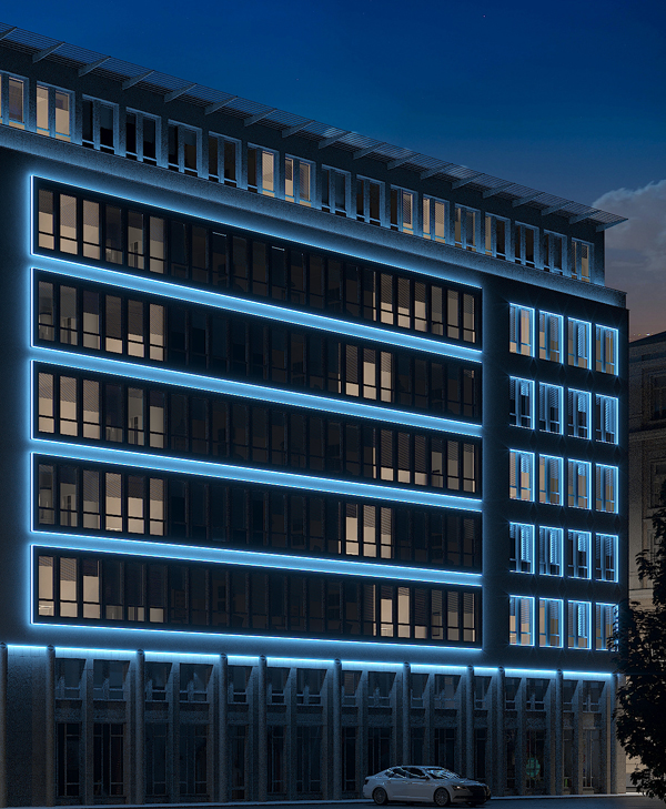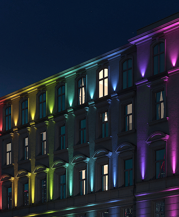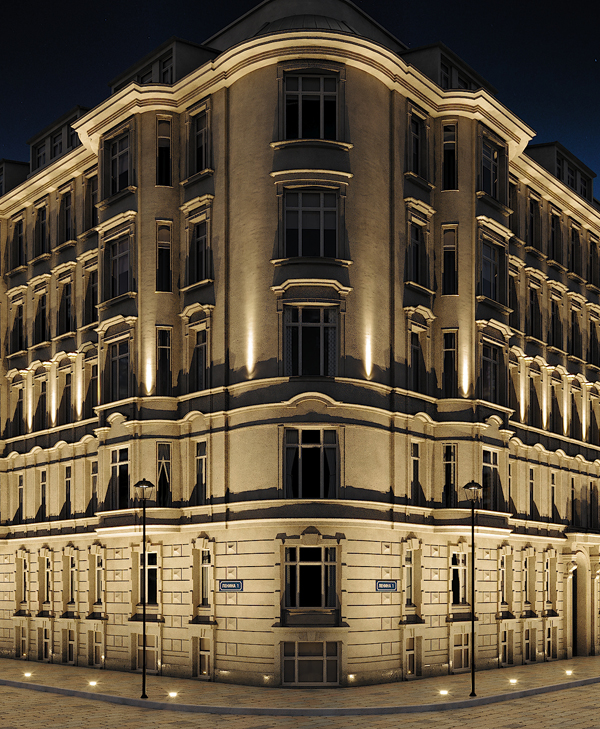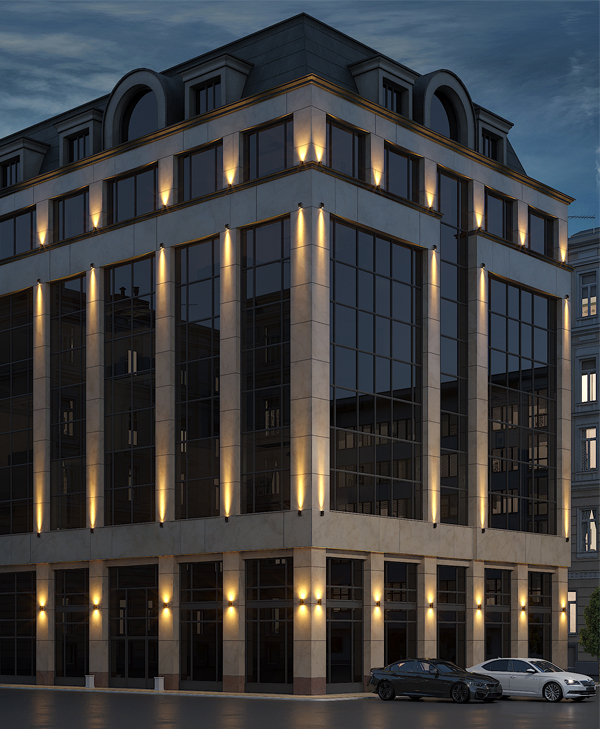 Создает равномерный эффект освещения фасада или отдельных его элементов. Реализуется за счет грамотного распределения светильников со вторичной оптикой.